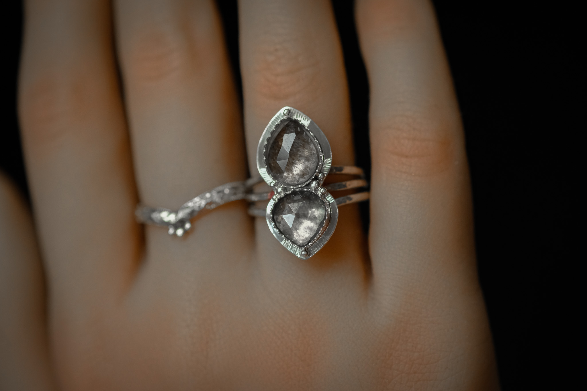 Bague en argent 925 composée de deux aigue-marine mousses, forgée et gravée à la main.