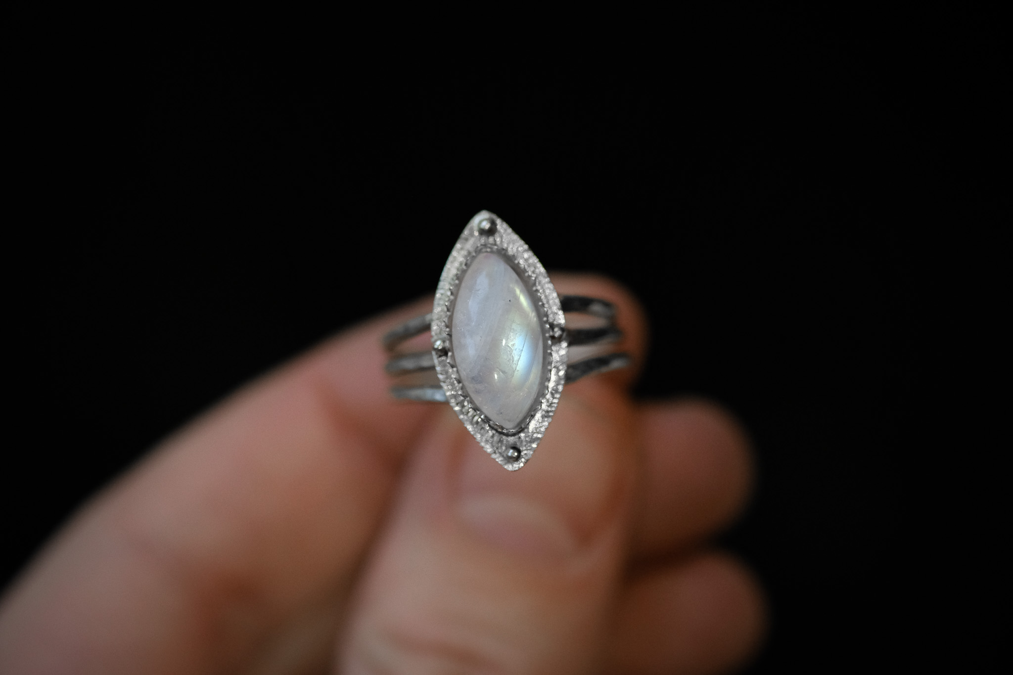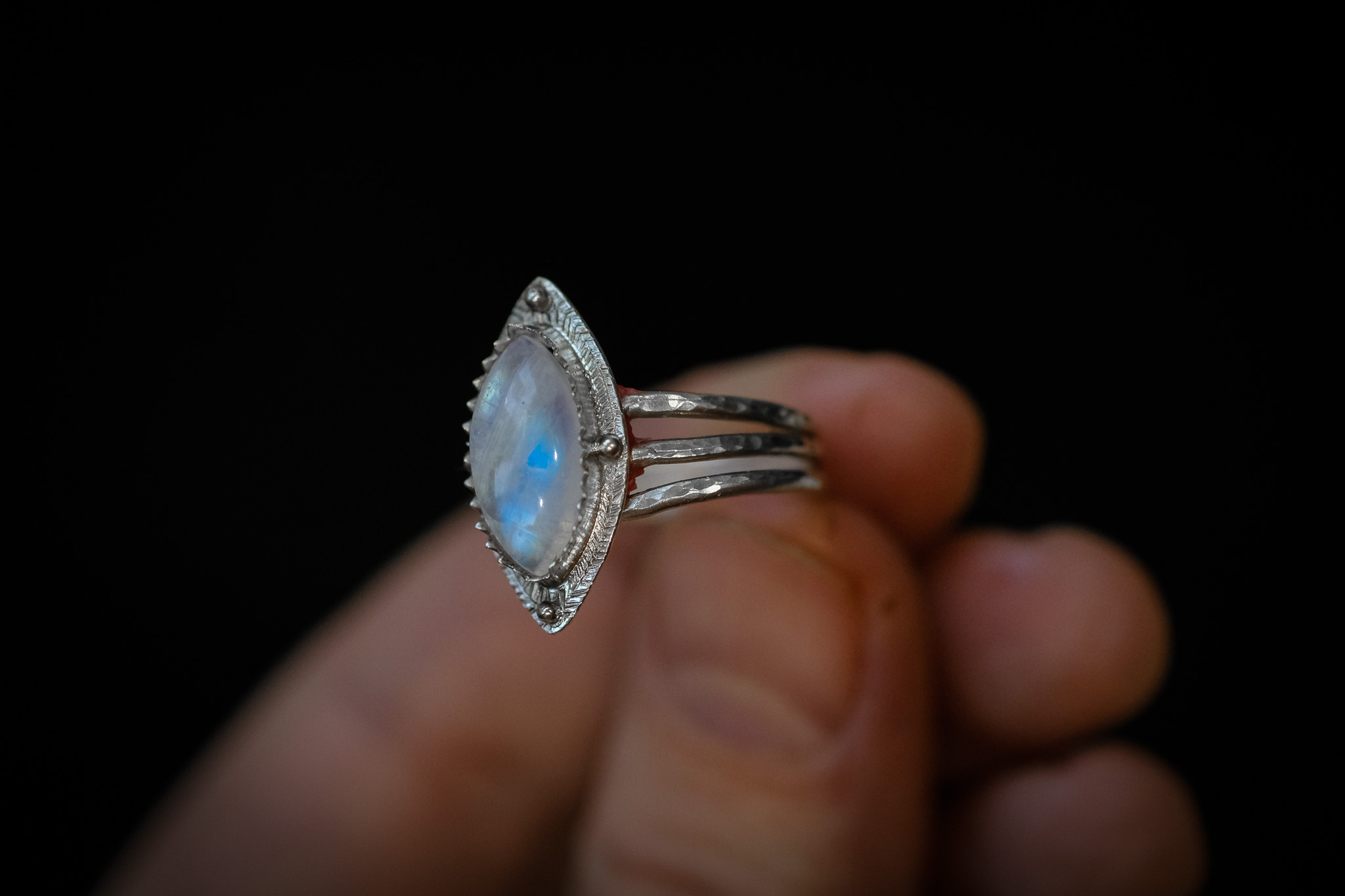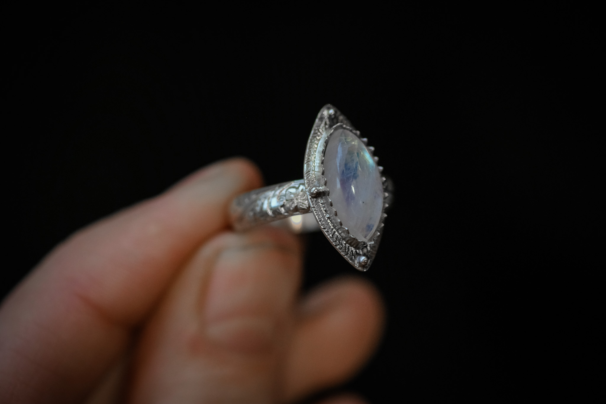 Bague en argent 925 composée d’une pierre de lune forgée et gravée à la main.