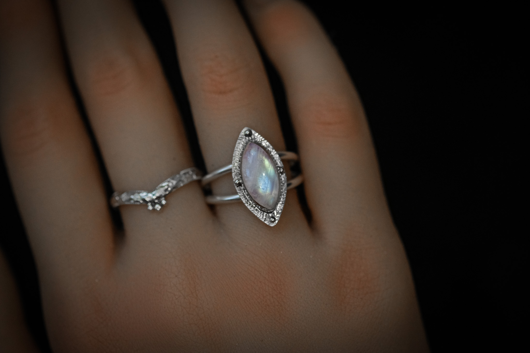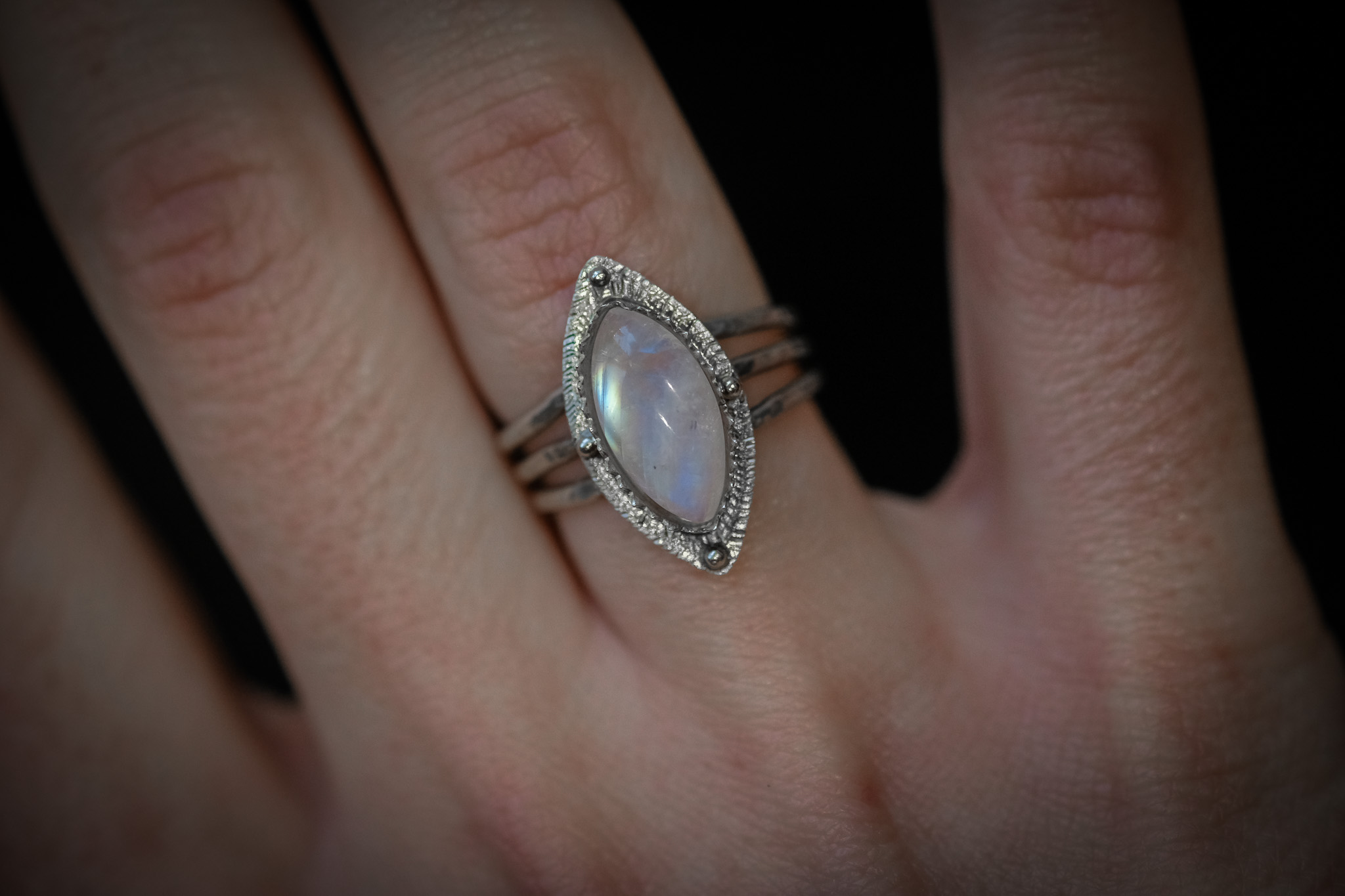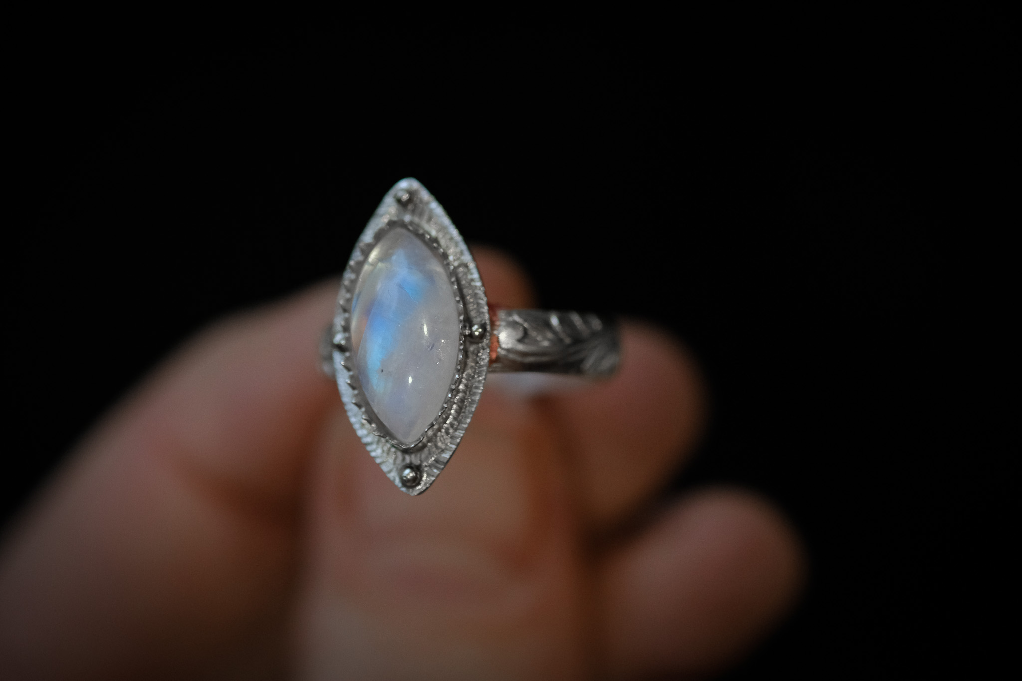Bague en argent 925 composée d’une pierre de lune forgée et gravée à la main.