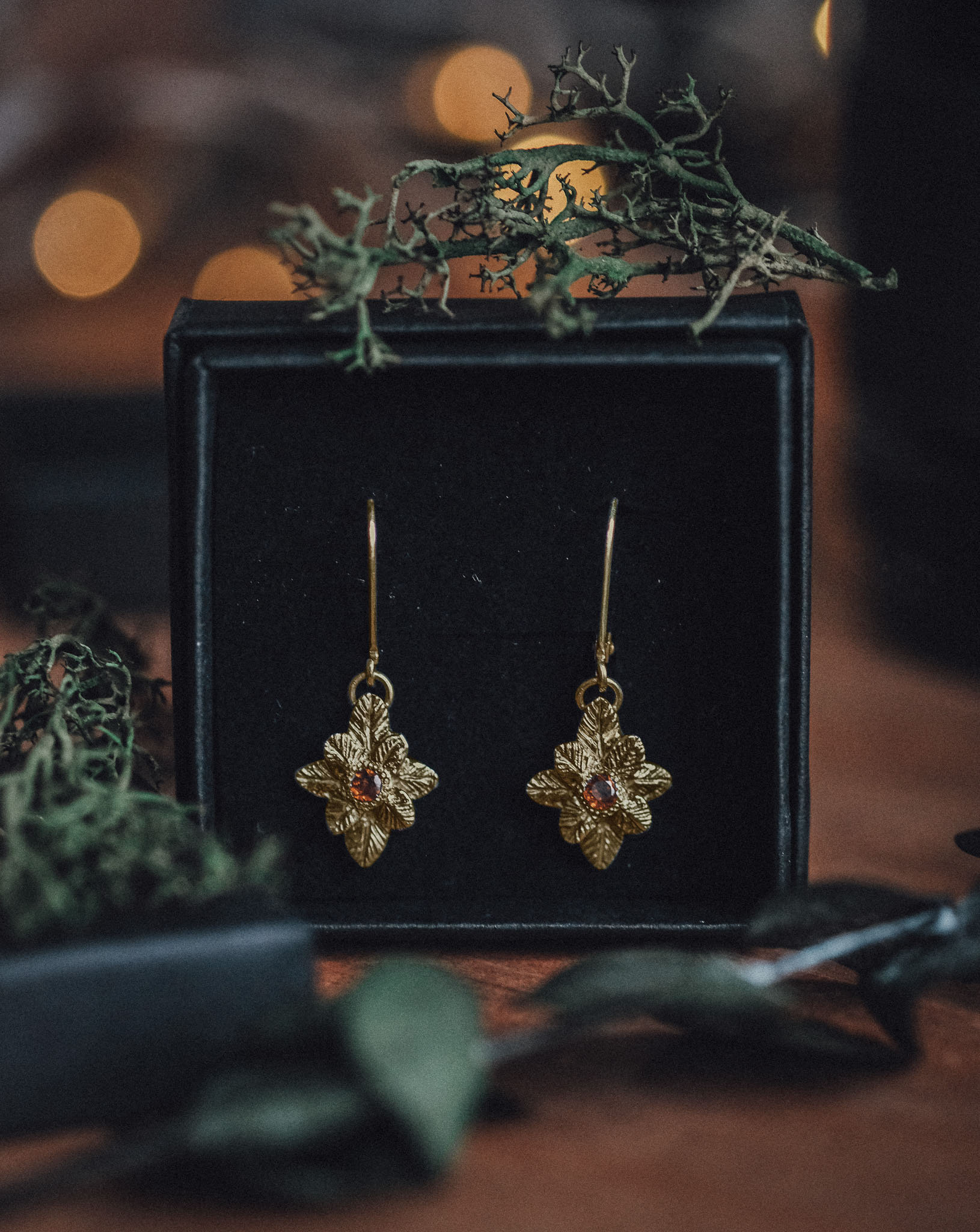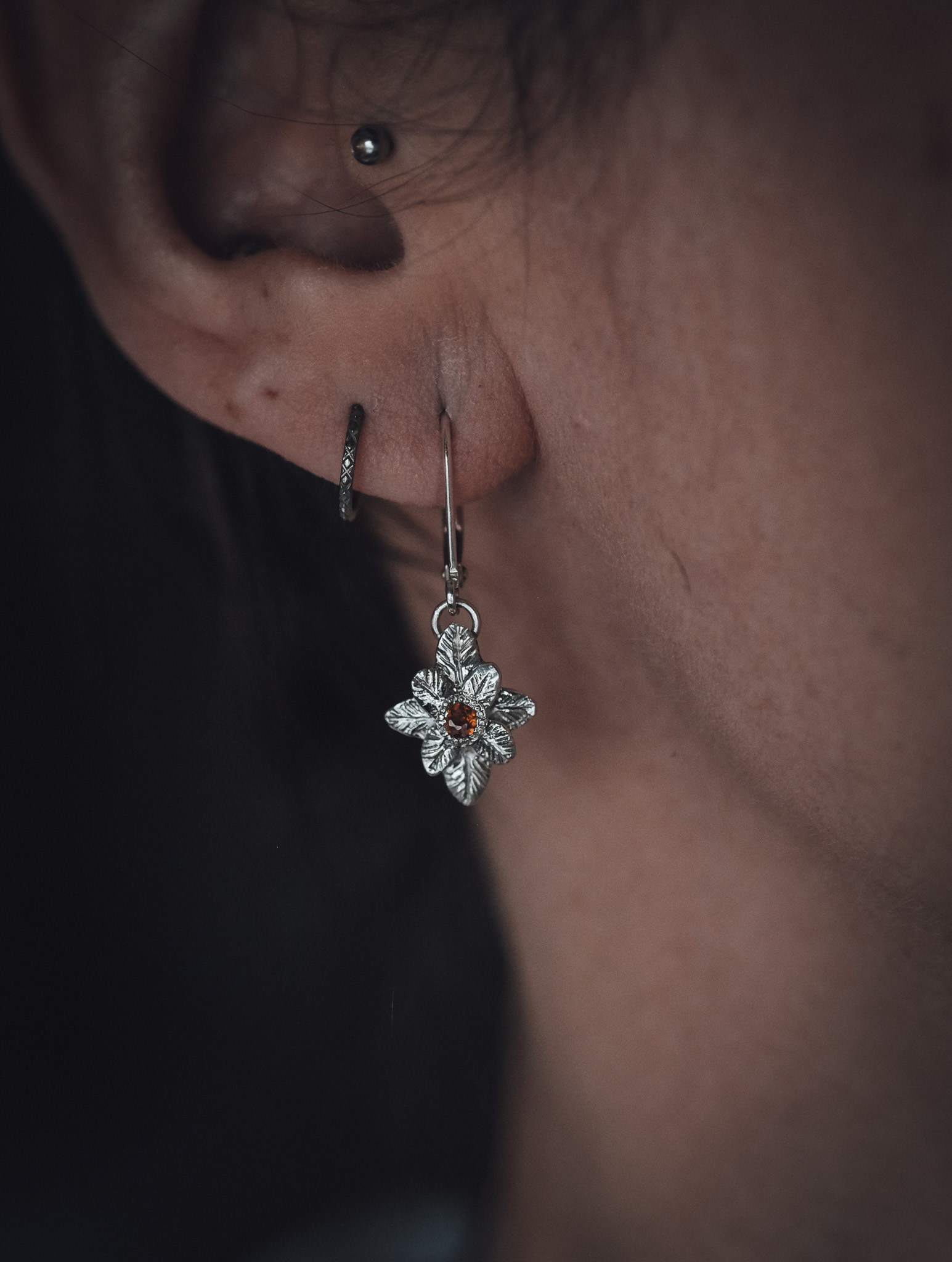 Cette création à l’aspect botanique et aux traits primitifs est inspirée de la bijouterie byzantine/perse. C’est une pièce discrète mais avec néanmoins beaucoup de caractère. L’Hessonite est une variété de Grenat Grossulaire qui appartient au pôle alumineux de la série calcique Ugrandite. Ce Grossulaire est parfois appelé Pierre de cannelle en référence à sa couleur, majoritairement causée par la présence de traces de fer dans sa structure chimique. Plus le fer ferreux sera présent et plus la couleur tendra vers le brun foncé. Les belles Hessonites sont convoitées autant par les bijoutiers-créateurs que par les collectionneurs.