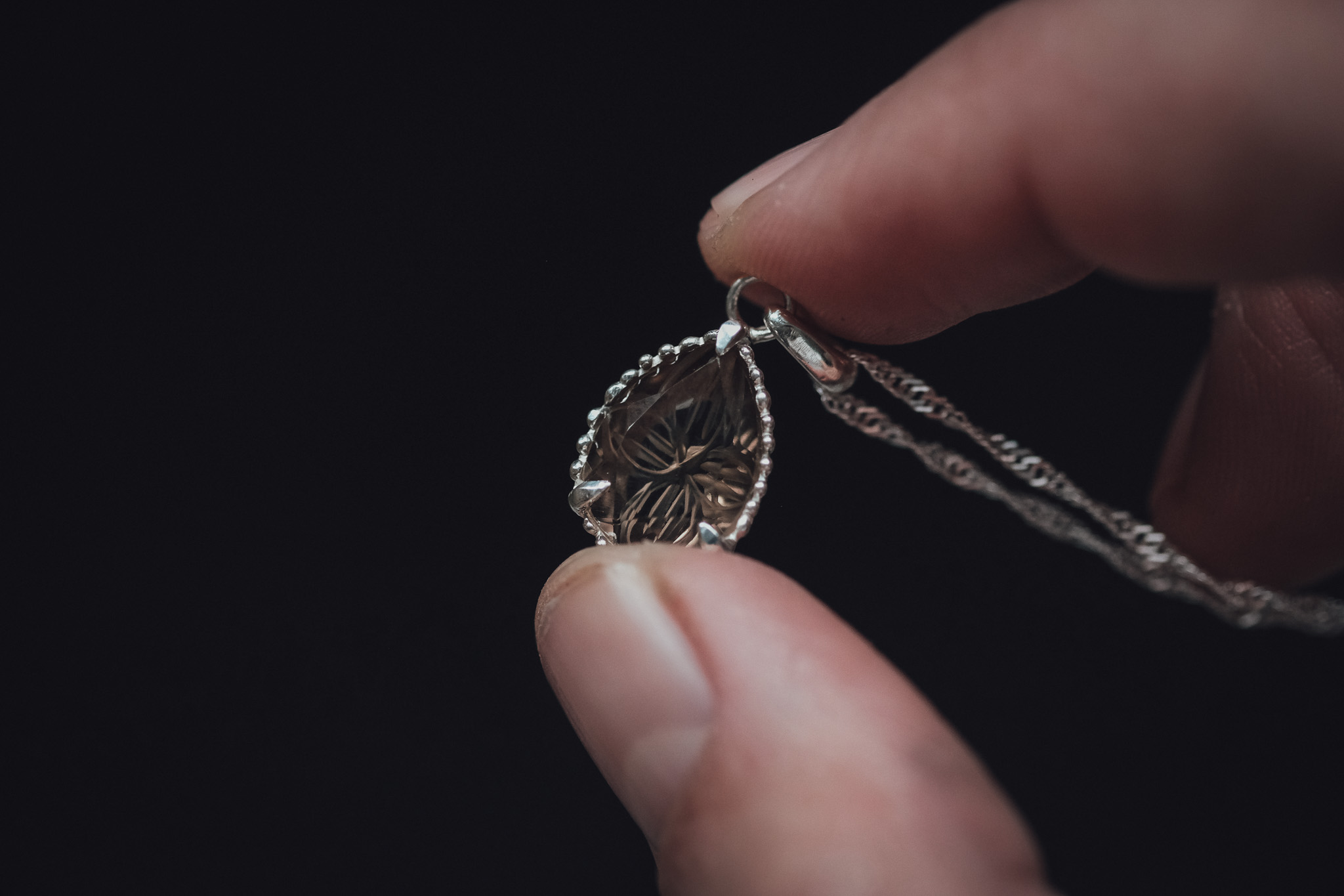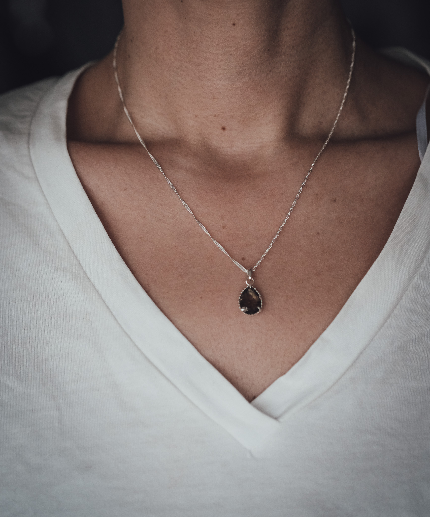 Collier en argent 925 composé d’un quartz fumé gravure intaglio (rare). Il s’agit d’une gravure inversée directement sur la pierre qui apparaît par transparence.