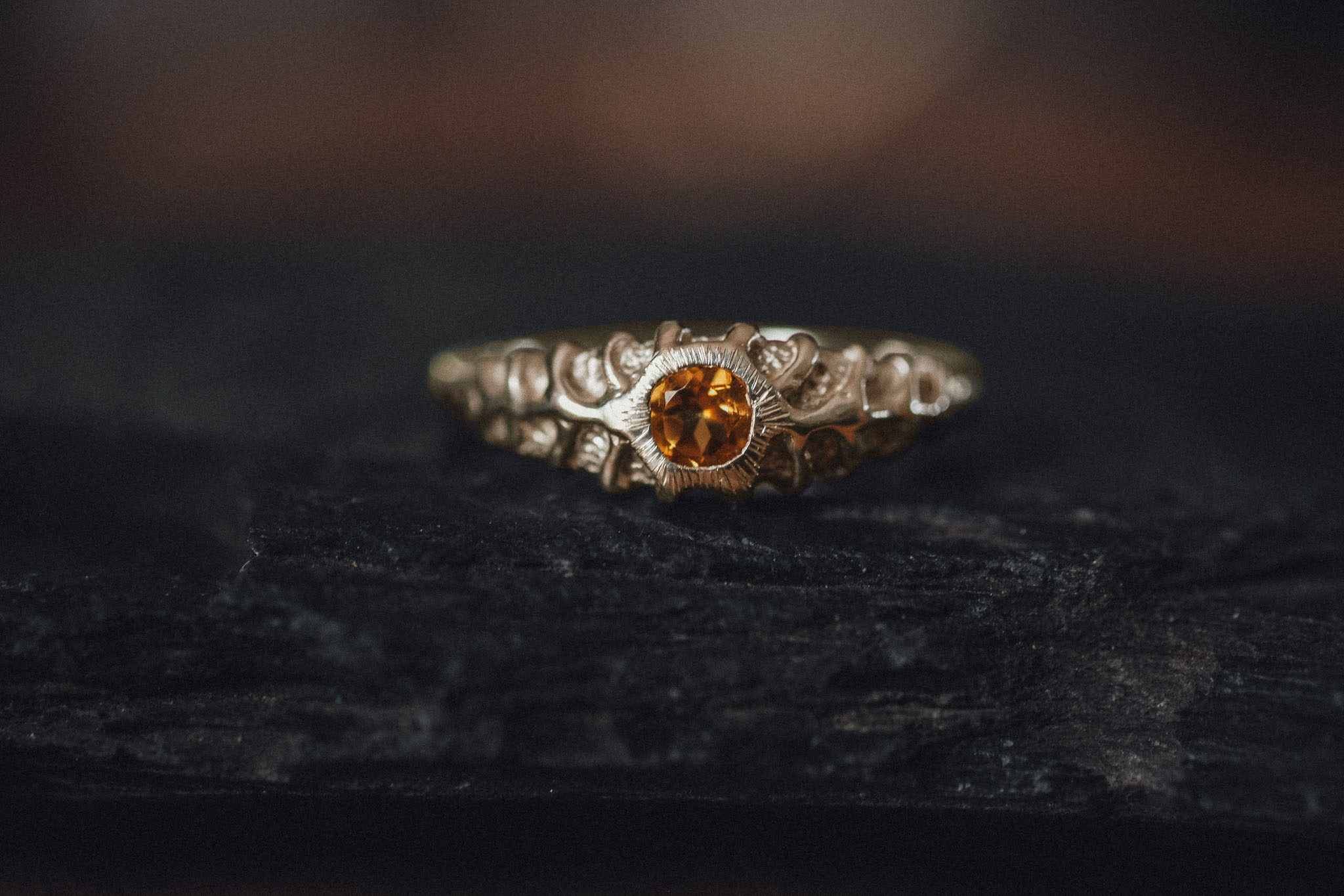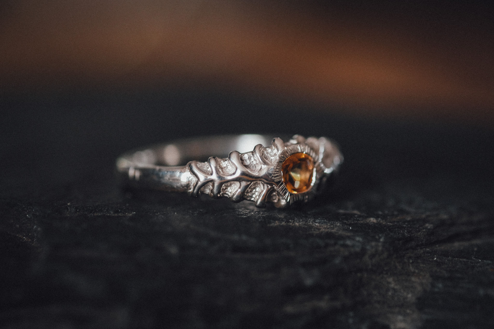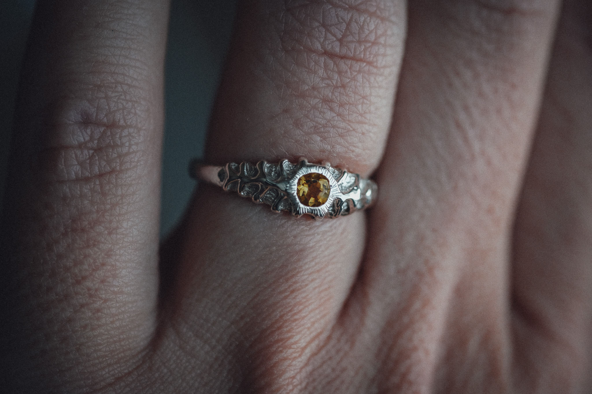 Bague en argent 925 aux allures organiques qui rappelle le lichen des arbres. Cette bague est composée d’une citrine.