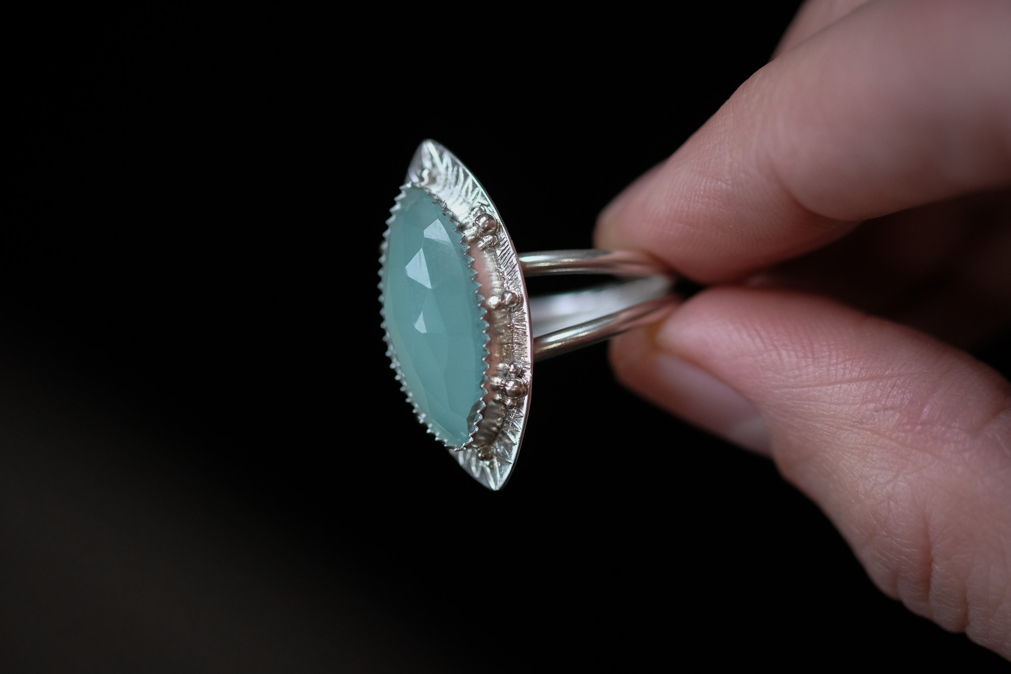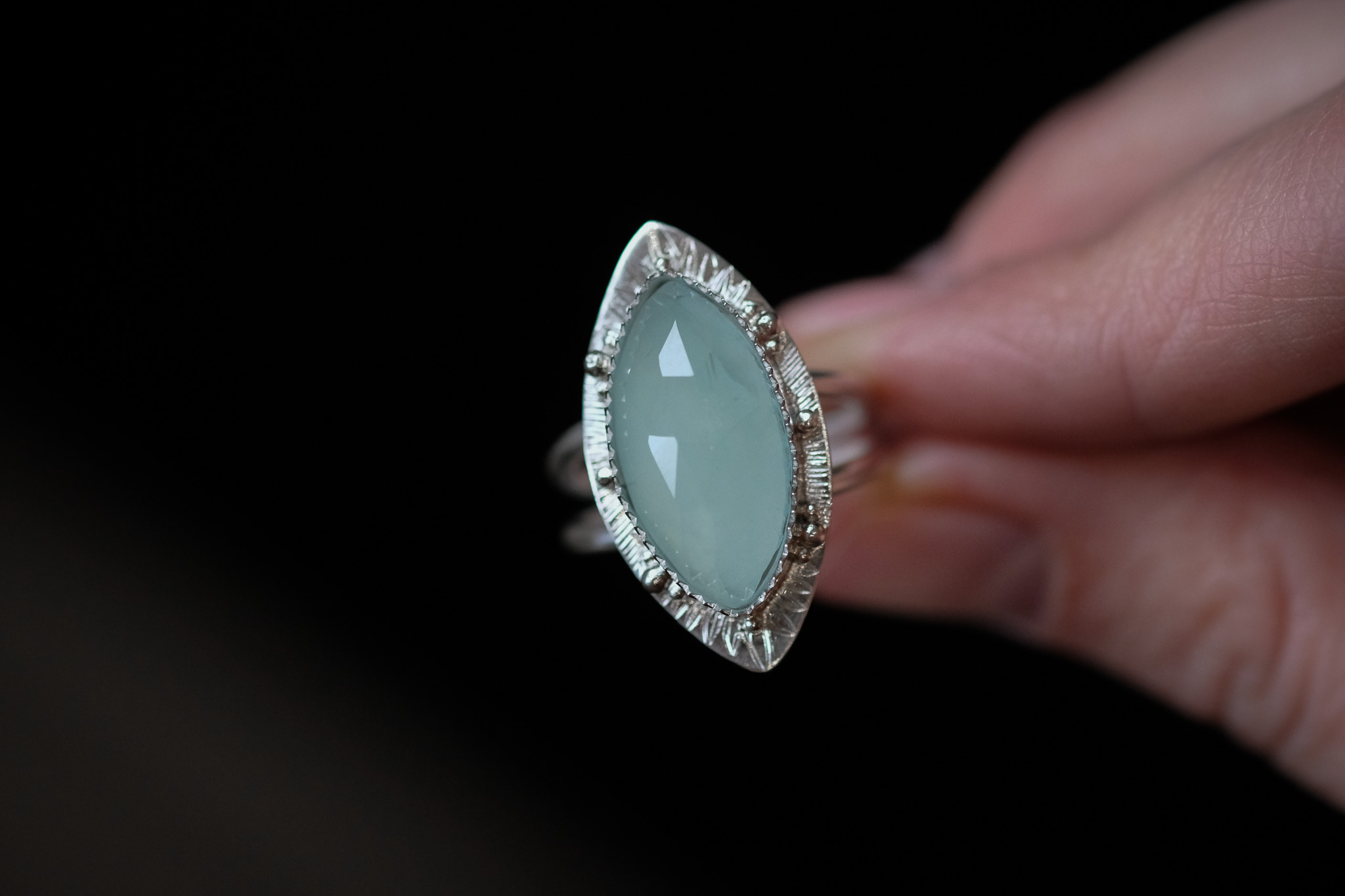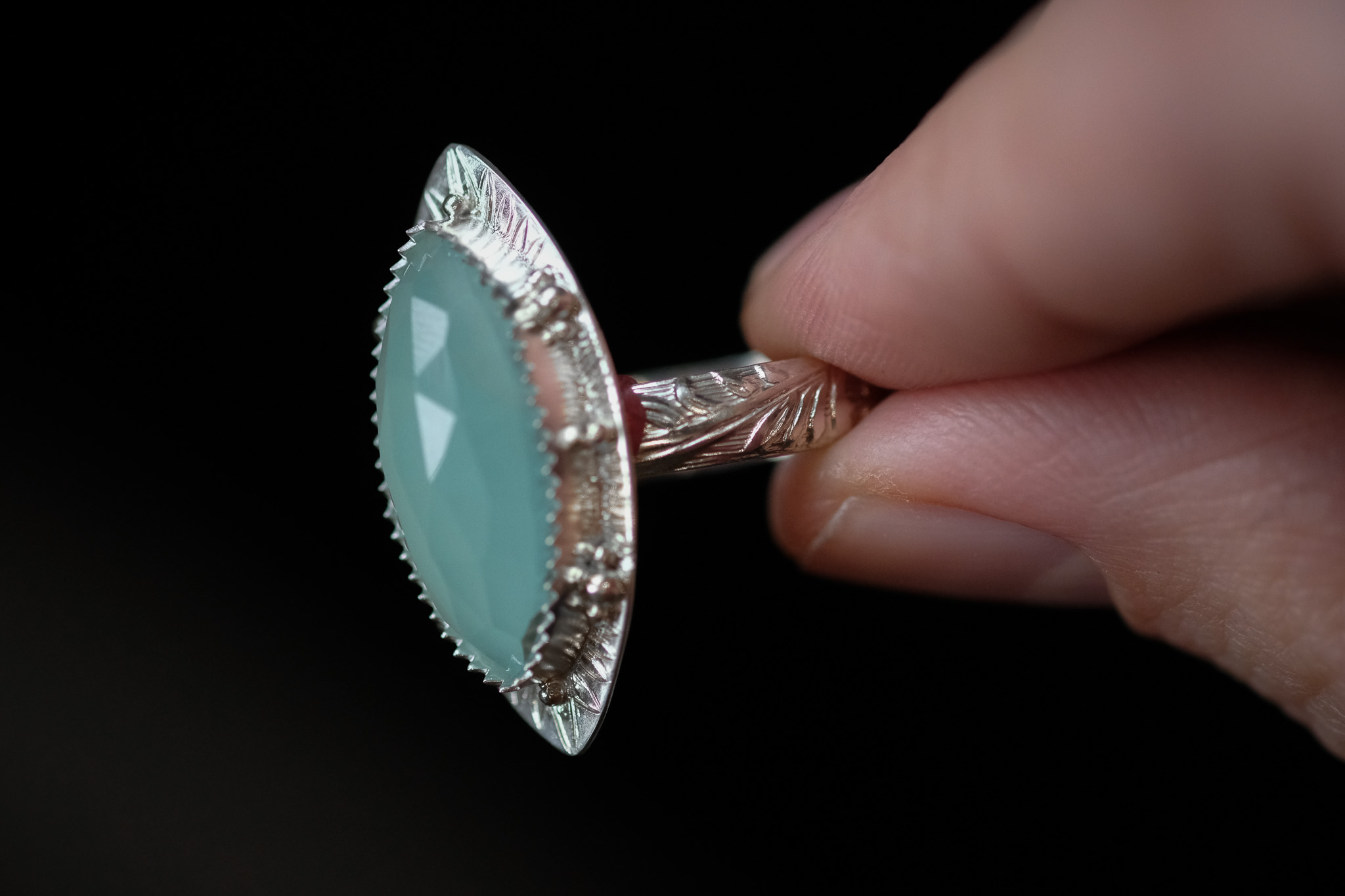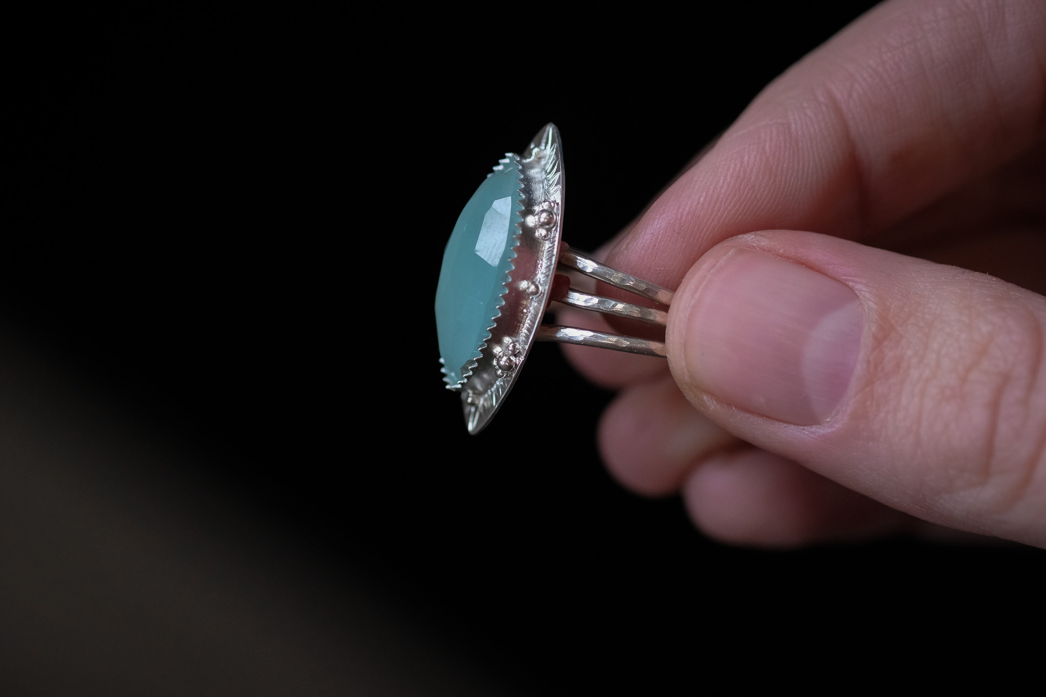 Bague en argent 925 composée d’une aigue-marine de 20mm, forgée et gravée à la main.