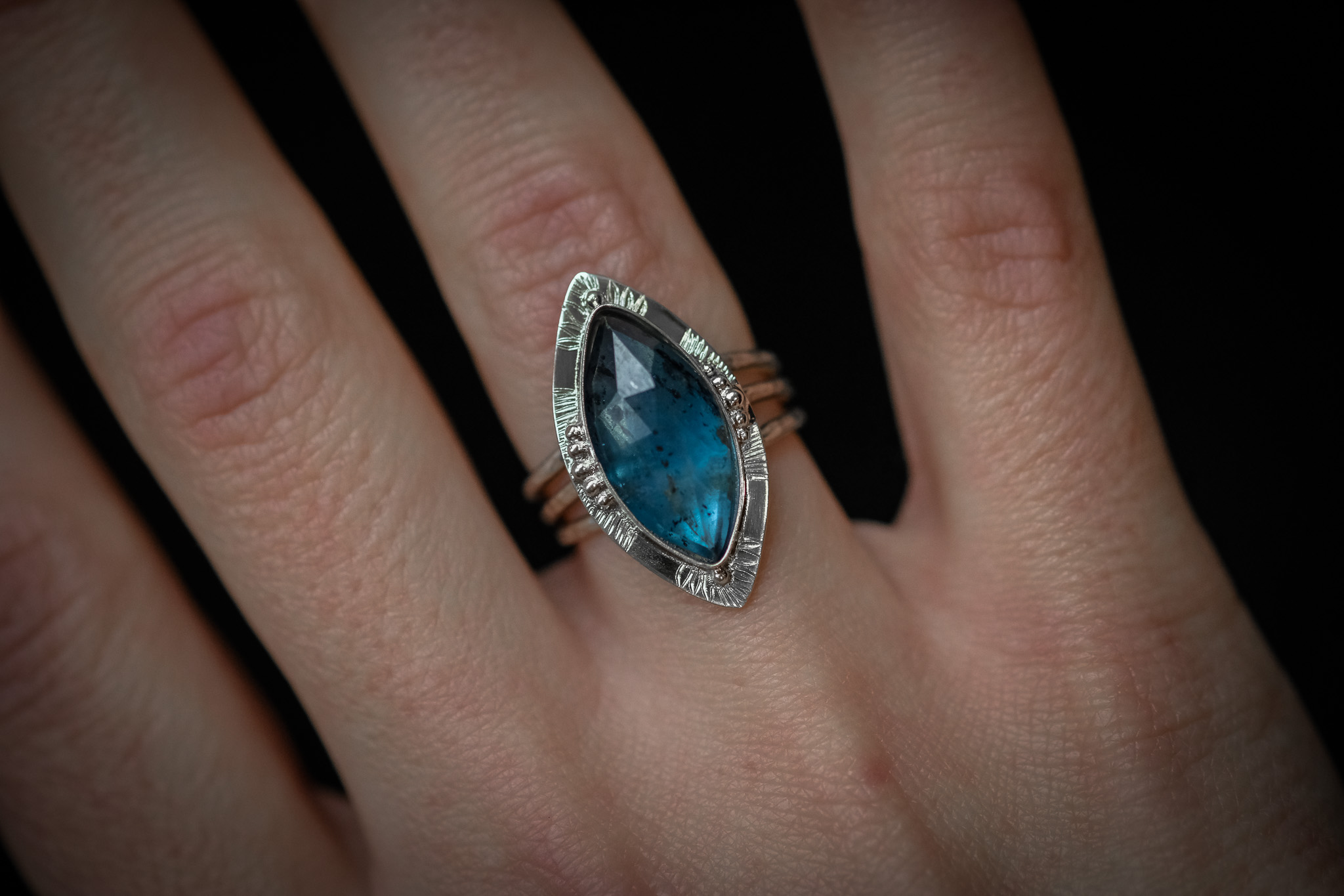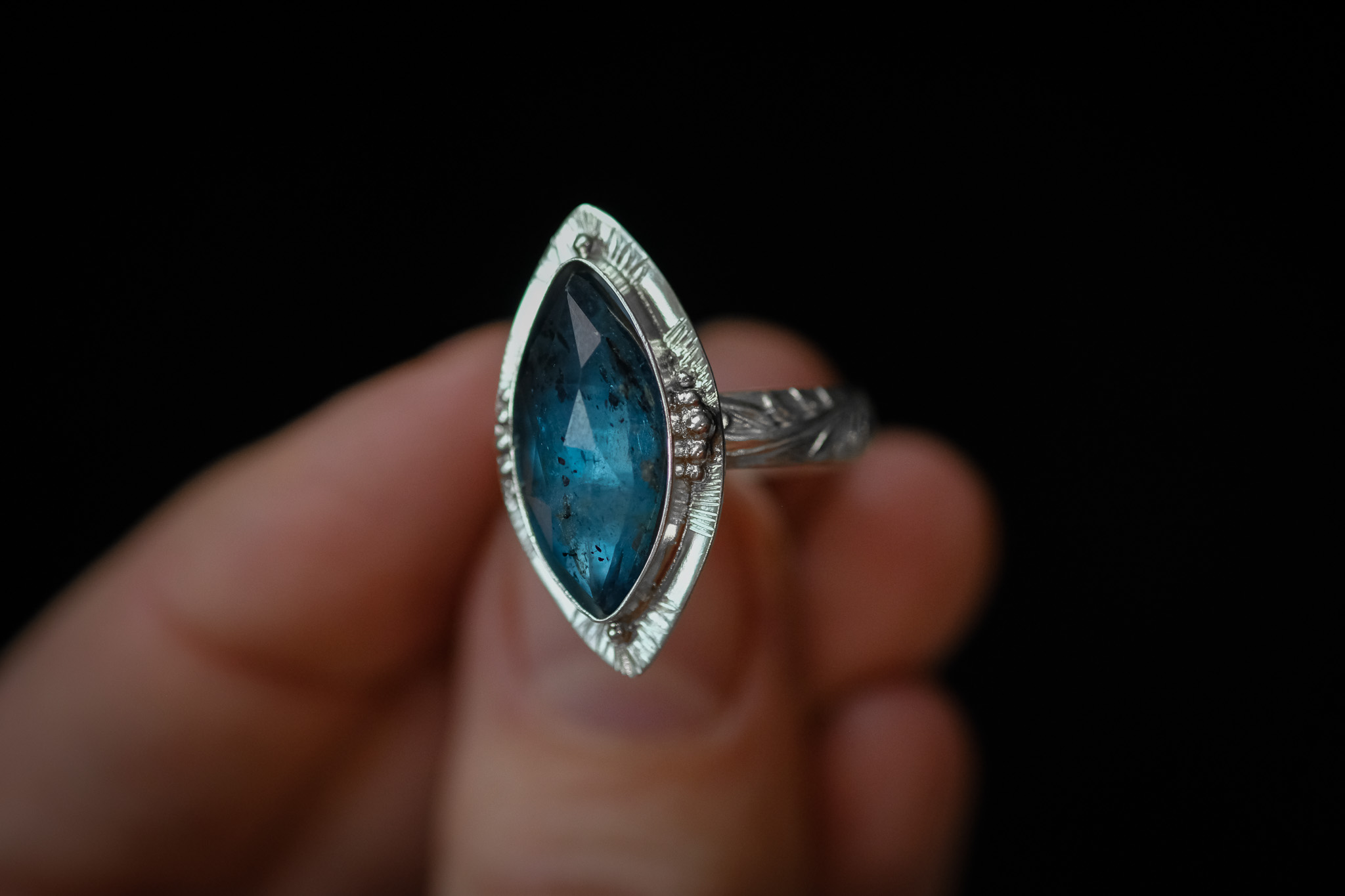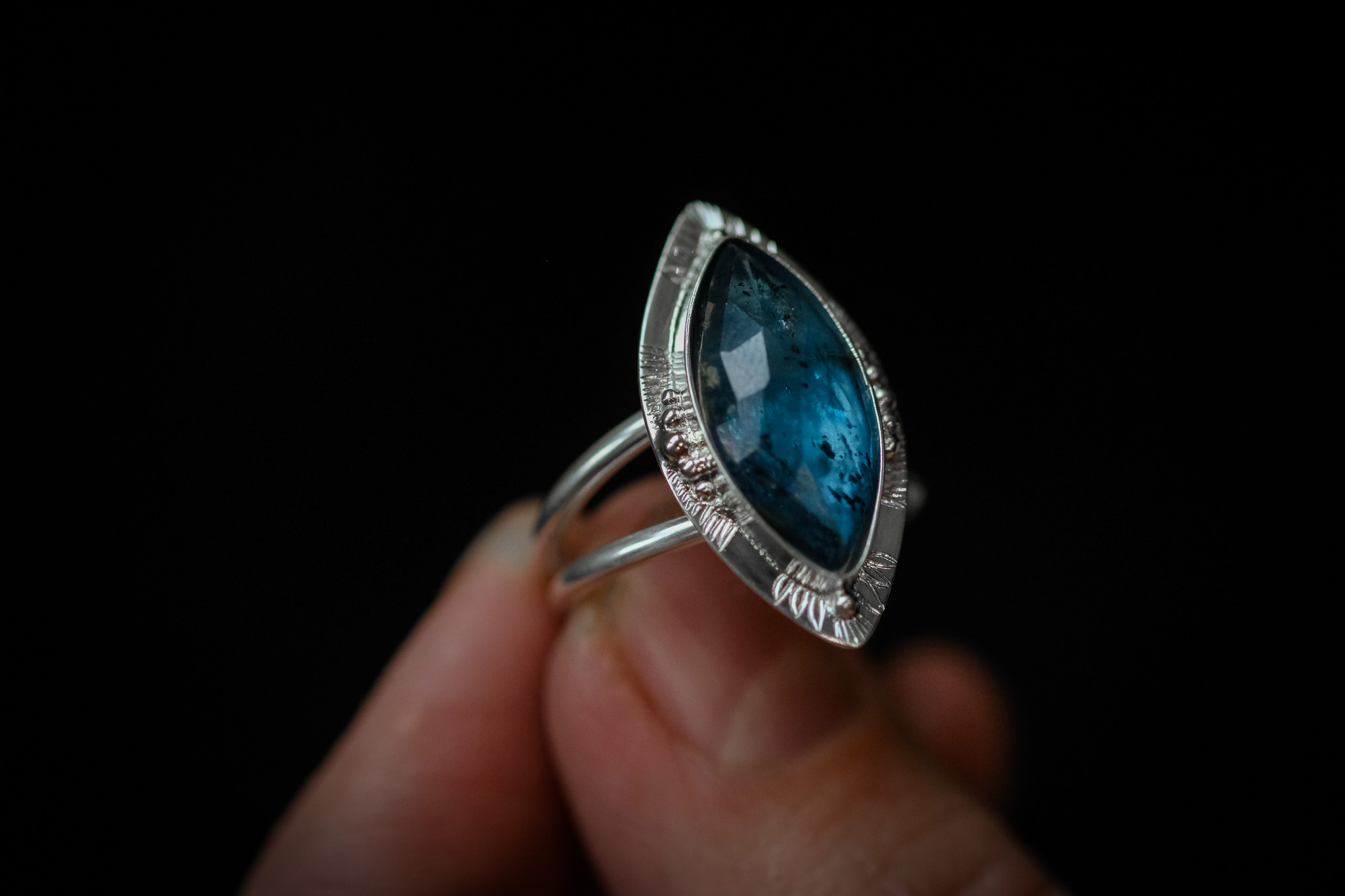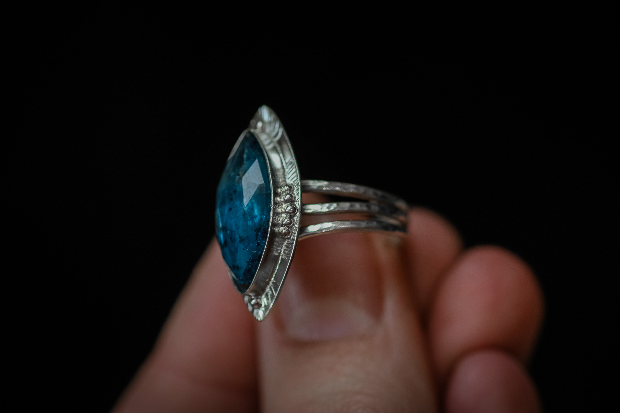 Bague en argent 925 composée d’une Cyanite bleue mousse, forgée et gravée à la main.